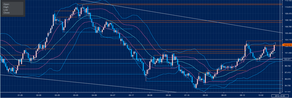 2012年は、上昇~下落を年前半に行い、後半は上昇傾向が続いています。ただ、ここにきて、これ以上、突き抜けて上昇できるかどうかの瀬戸際です。相場的には、下落を予想しての売りも上昇を期待しての買い、両方チャレンジできるFXトレーダーにとって面白い局面にあります。