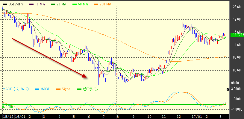 ●米ドル/円の日足チャート:2017年3月15日 SBIFXトレードで移動平均線とMACDを表示。
